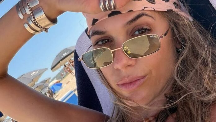 En una de las fotos de su Instagram, se mostró con un corpiño de bikini gris de formato entero, con pliegues y arandelas, y short de jean tiro alto. El complemento estrella del estilismo fue un pañuelo color ladrillo de estampado floral. Como detalle final, sumó anteojos de sol con cristales rosas.