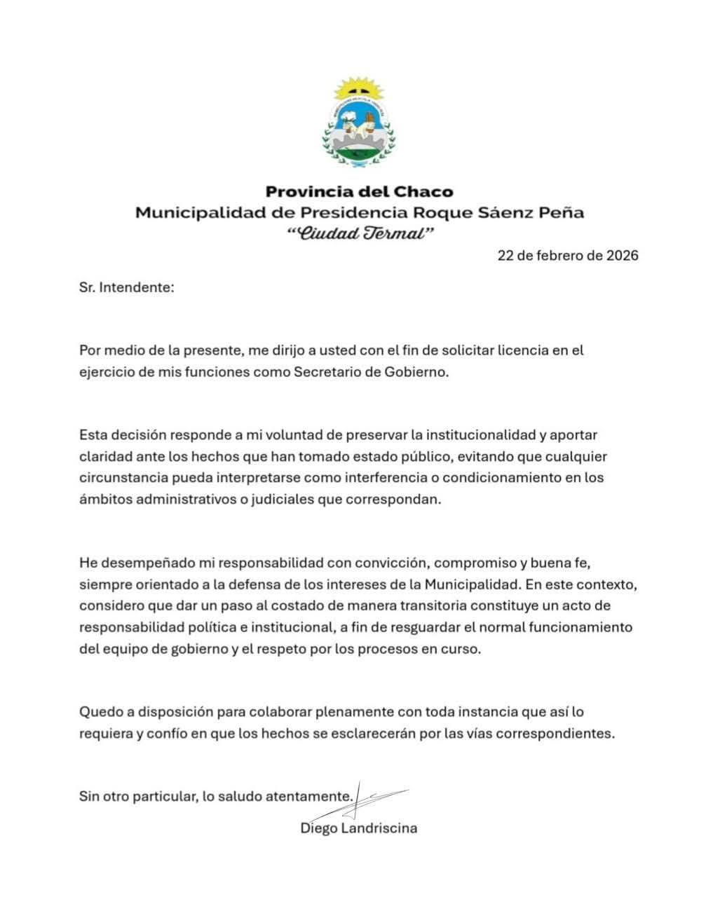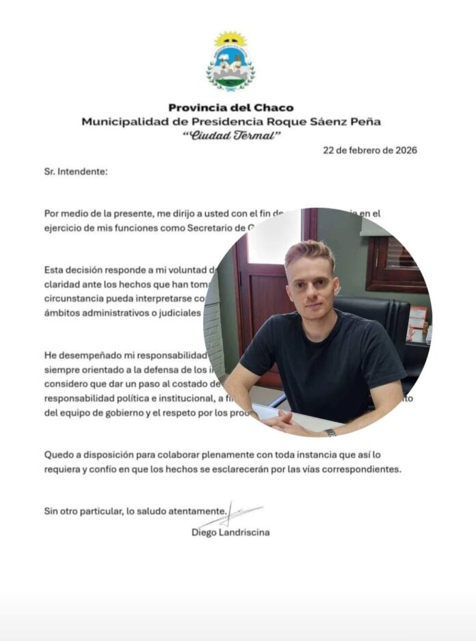 Fuentes oficiales confirmaron que Diego Landriscina solicitó formalmente una licencia a su cargo como Secretario de Gobierno este domingo 22 de febrero de 2026, convirtiéndose en el primer funcionario de alto rango en dar un paso al costado tras estallar la crisis por las inversiones municipales. Quienes siguen de cerca la gestión de Bruno Cipolini interpretan esta decisión como una consecuencia directa del escándalo vinculado a la Bolsa de Comercio del Chaco, donde el municipio habría operado con fondos públicos en instrumentos de alto riesgo, generando pérdidas que, según denuncias opositoras, superarían los mil millones de pesos.