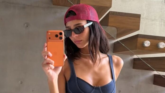 En una siguiente selfie frente al espejo, volvió a mostrar el corpiño de una bikini. En este caso, un modelo gris topo estilo corset con costuras a la vista. Lo combinó con un pequeño pareo blanco tejido, anteojos de sol con marco de carey y la misma gorra bordó.