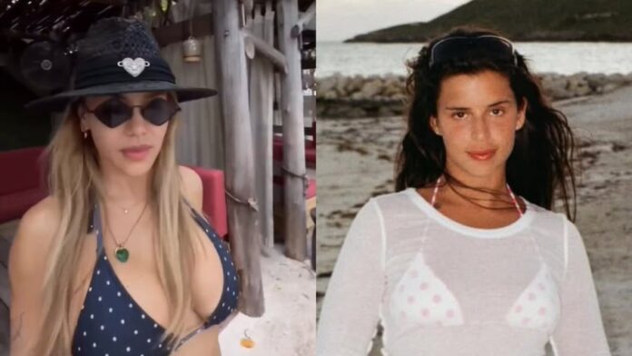 Las transparencias del diseño, largo y ajustado, dejaron a la vista la parte de abajo del traje de baño: una bombacha negra lisa colaless. Los complementos tampoco pasaron desapercibidos. Se puso brazaletes dorados y plateados, una cadena con una piedra verde y anteojos de sol negros con cristales en forma de rombos.