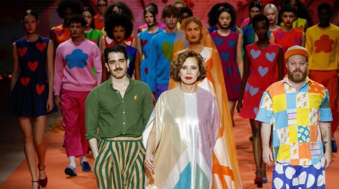 Fiel a su universo de color, Agatha Ruiz de la Prada realizó una colaboración con la firma Colors y comenzó el desfile como en un tablero de parchís, con modelos vestidos en azul, amarillo, verde, naranja y rosa.