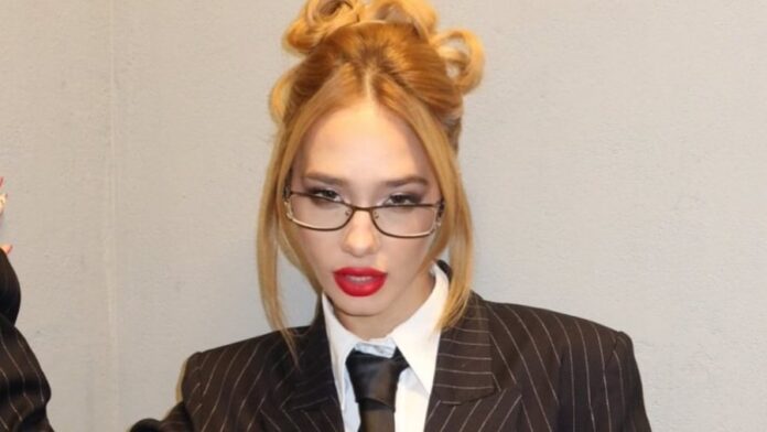 HomeEspectaculosMODAÁngela Torres combinó sastrería, corbata y minifalda para subirse al escenario