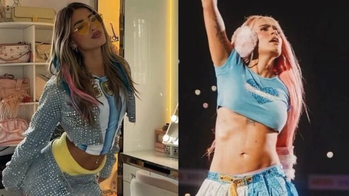 Julieta Poggio apostó por un estilismo audaz y con identidad propia que combinó guiños internacionales con un fuerte sello argentino. Se inspiró en Karol G cuando la artista lució los colores patrios en su show argentino. Construyó un look festivo pensado para Coachella, donde mezcló referencias pop con símbolos nacionales.