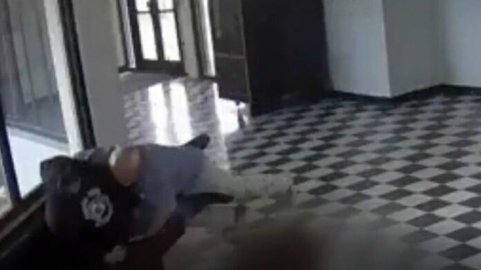 Luego, otro funcionario escolar entró en el encuadre y pateó el arma para alejarla. Enseguida, recogió la pistola y se la llevó.