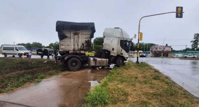 Durante el despiste, el pesado rodado impactó violentamente contra una jirafa de alumbrado público ubicada en el cantero central y luego contra un semáforo de la intersección. Debido a la rotura del tendido eléctrico y los postes, fue necesaria la intervención de una cuadrilla de Secheep junto a la Policía Caminera para asegurar la zona.