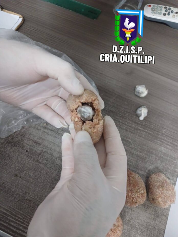 Durante el control de alimentos entregados por una mujer, el personal policial detectó cuatro envoltorios con sustancia vegetal escondidos en albóndigas. Ante ello se dio intervención a la División Drogas, que realizó la prueba de campo correspondiente.