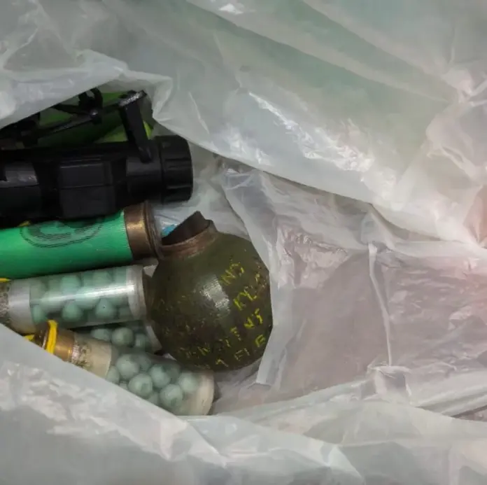 Uno de los hallazgos más relevantes fue el secuestro de una granada de mano FMK2 activa, la cual fue asegurada por personal especializado de la División Bomberos para su resguardo y posterior intervención.