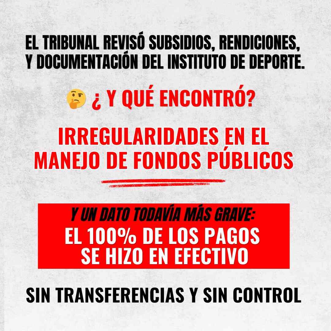 Pero quizás lo más alarmante no sea solo el monto ya observado, sino el contexto de funcionamiento que empieza a quedar expuesto. Según lo informado, el Tribunal también determinó que el 100% de los pagos realizados desde el Instituto del Deporte se hizo en efectivo. En cualquier administración pública seria, un dato de semejante magnitud encendería todas las alarmas. El uso sistemático del efectivo no solo debilita la trazabilidad de los recursos, sino que abre la puerta a prácticas incompatibles con una gestión transparente.